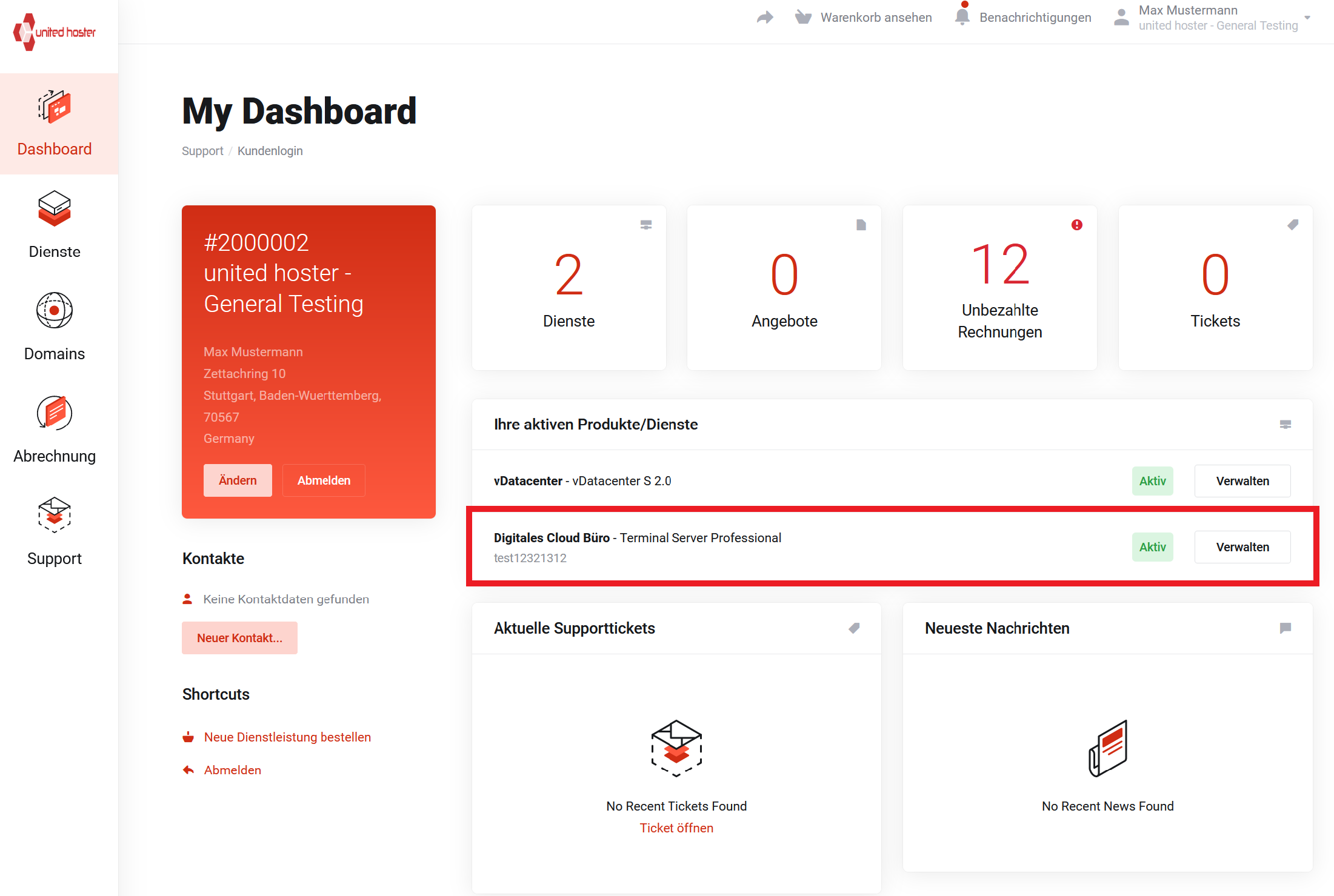 Über den Button „Verwalten“ im Dashboard gelangen Sie zur Verwaltungsseite Ihres Terminal Servers.