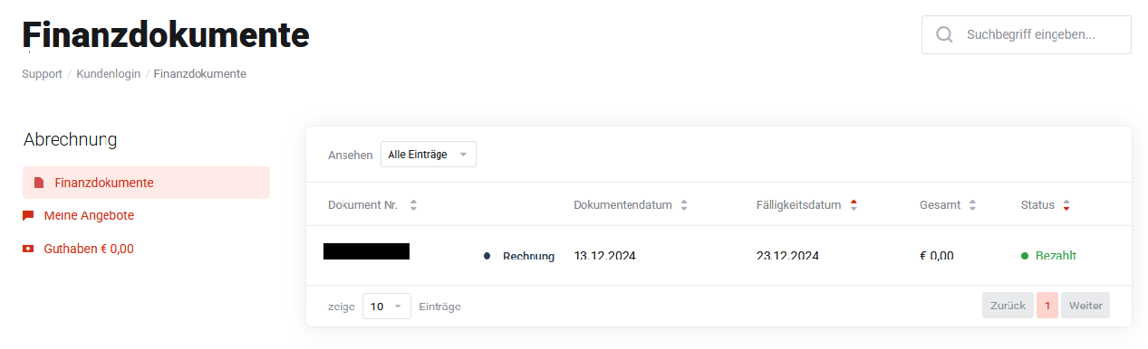 Sämtliche Rechnungen werden per E-Mail an die dafür hinterlegte E-Mailadresse gesendet. Alle Rechnungen stehen Ihnen im Kundenportal zur Einsicht und auch zum Download bereit. Zudem sehen Sie in der Rechnungsübersicht den Zahlungsstatus der einzelnen Rechnungen