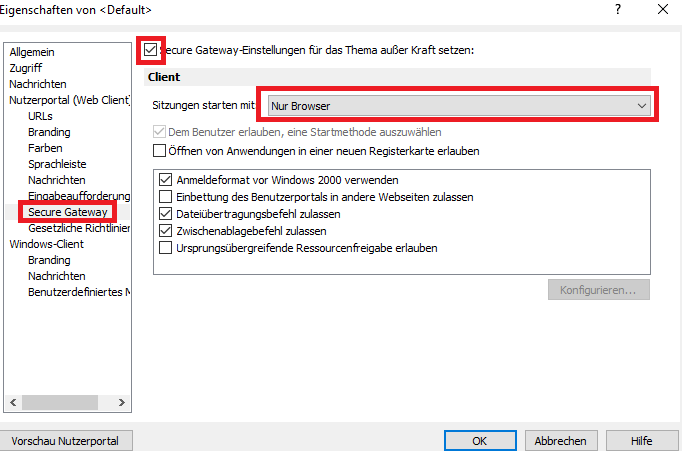 Im neuen Fenster gehen Sie Links auf Gateway und setzen anschließend den Haken bei Gateway-Einstellungen für das Schema überschreiben.