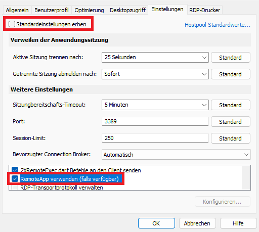 3. Unter dem Reiter Einstellungen entfernen Sie den Haken bei "Standardeinstellungen erben" und setzen im Menü unten den Haken bei "RemoteApp verwenden (falls verfügbar)"