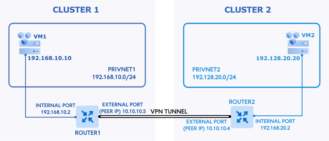 - Im cluster 1 ist die virtuelle Maschine VM1 über die Netzwerkschnittstelle mit der IP-Adresse 192.168.10.10 mit dem virtuellen Netzwerk privnet1 (192.168.10.0/24) verbunden. Das Netzwerk privnet1 ist über den Router router1 mit dem externen Port 10.10.10.5 für öffentliche Netzwerke zugänglich.