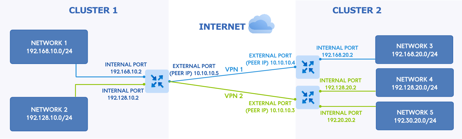- VPN1 verwendet IKEv1 und verbindet das Netzwerk network1 mit dem network3.