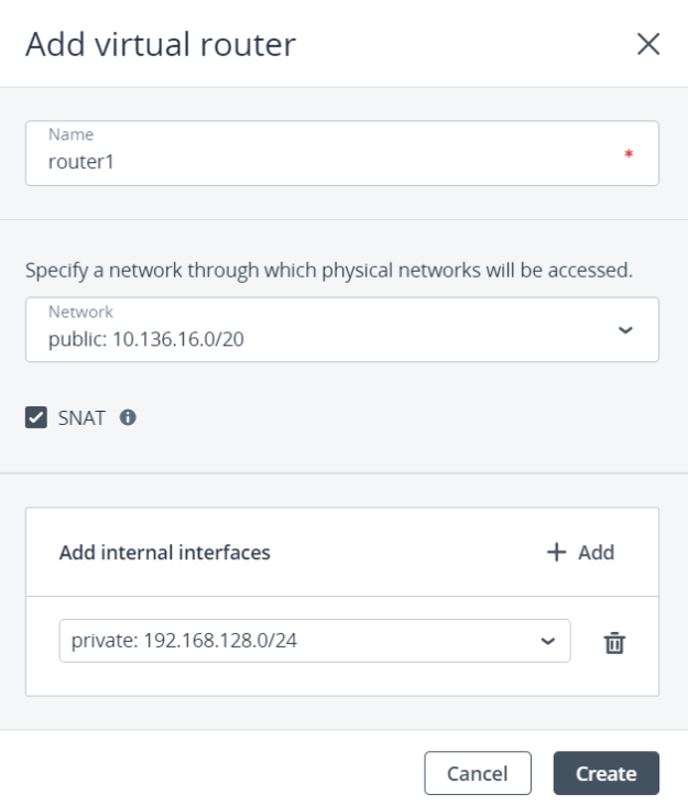 Aktivieren oder deaktivieren Sie optional das Kontrollkästchen SNAT, um SNAT auf dem externen Gateway des Routers zu (de)aktivieren. Wenn SNAT aktiviert ist, ersetzt der Router die privaten IP-Adressen der VM durch die öffentliche IP-Adresse seines externen Gateways.