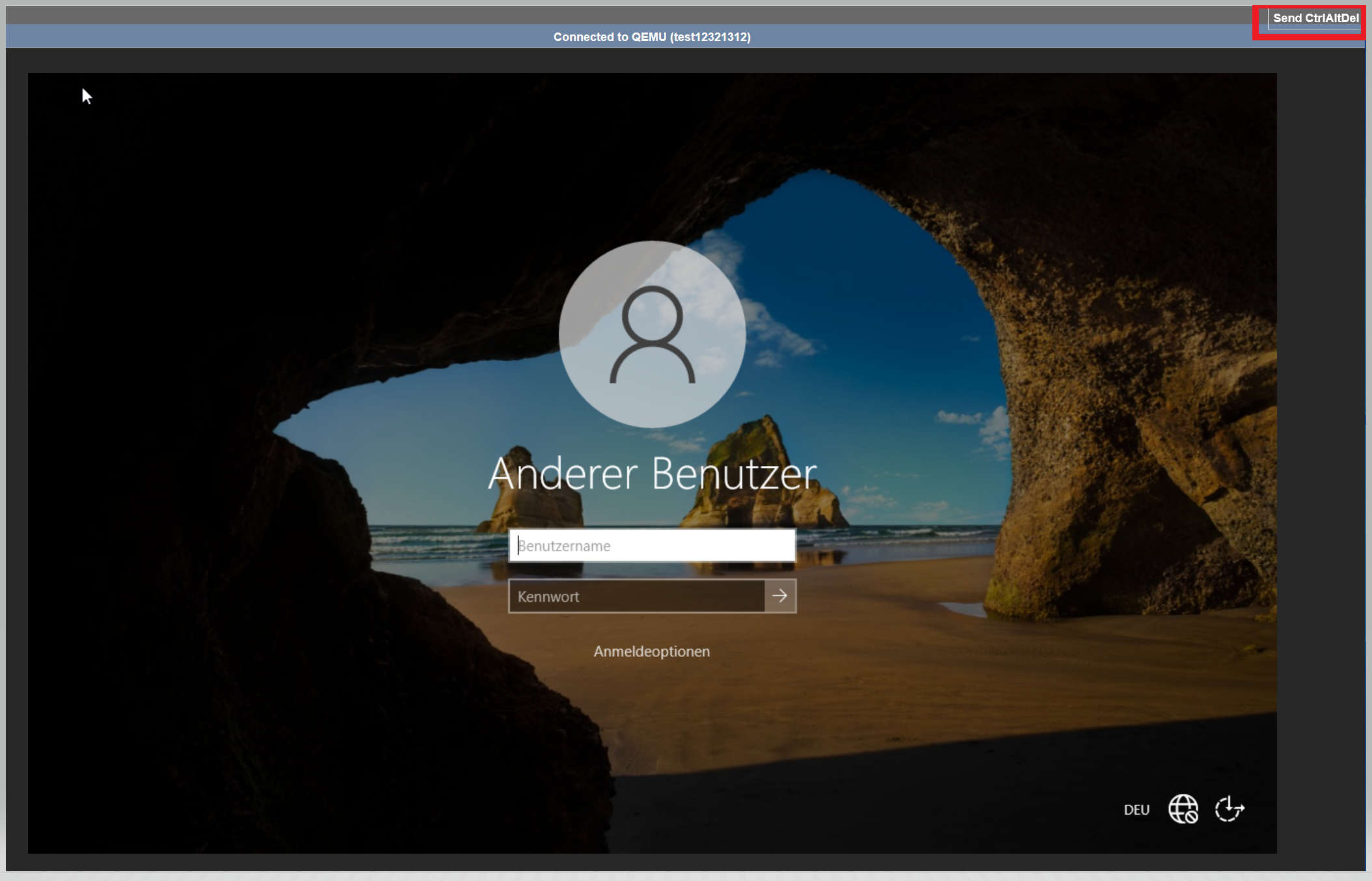 4. Klicken Sie im neuen Fenster oben rechts auf den Button „Send CtrlAltDel“, um zur Eingabemaske zu gelangen