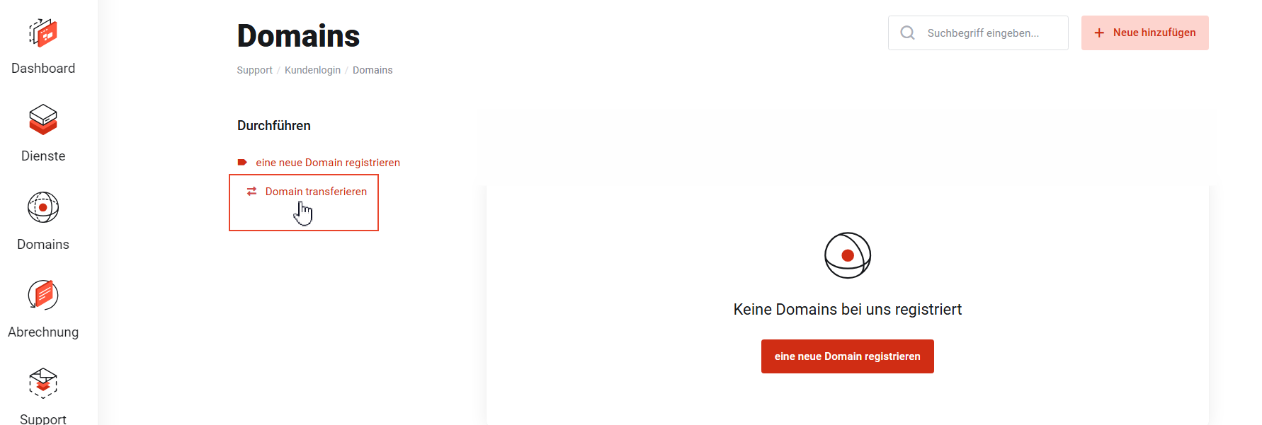 1. Nach dem Login am Kundenportal klicken Sie auf die Schaltfläche "Domains" in Ihrem Dashboard