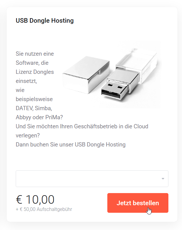 Bitte achten Sie darauf, den richtigen Dienst bei der USB Dongle Hosting Paket Buchung auszuwählen.