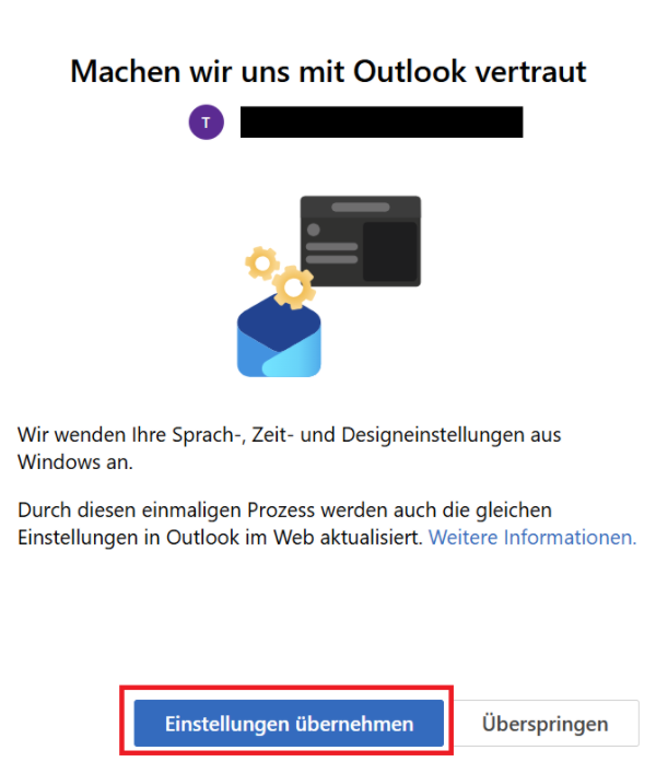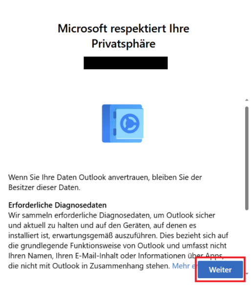 Um Outlook (new) nutzen zu können, ist eine Synchronisierung mit der Microsoft Cloud notwendig. Wenn Sie diesem zustimmen, klicken Sie den Button "Weiter".