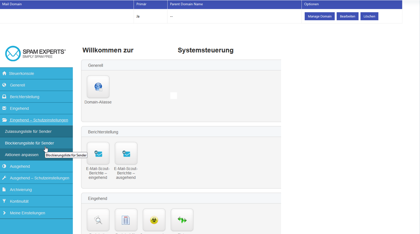 Es öffnet sich nun die SpamExperts Verwaltungsoberfläche, über die Sie Ihre AntiSpam Einstellungen (Blacklist / Whitelist ) bearbeiten können.