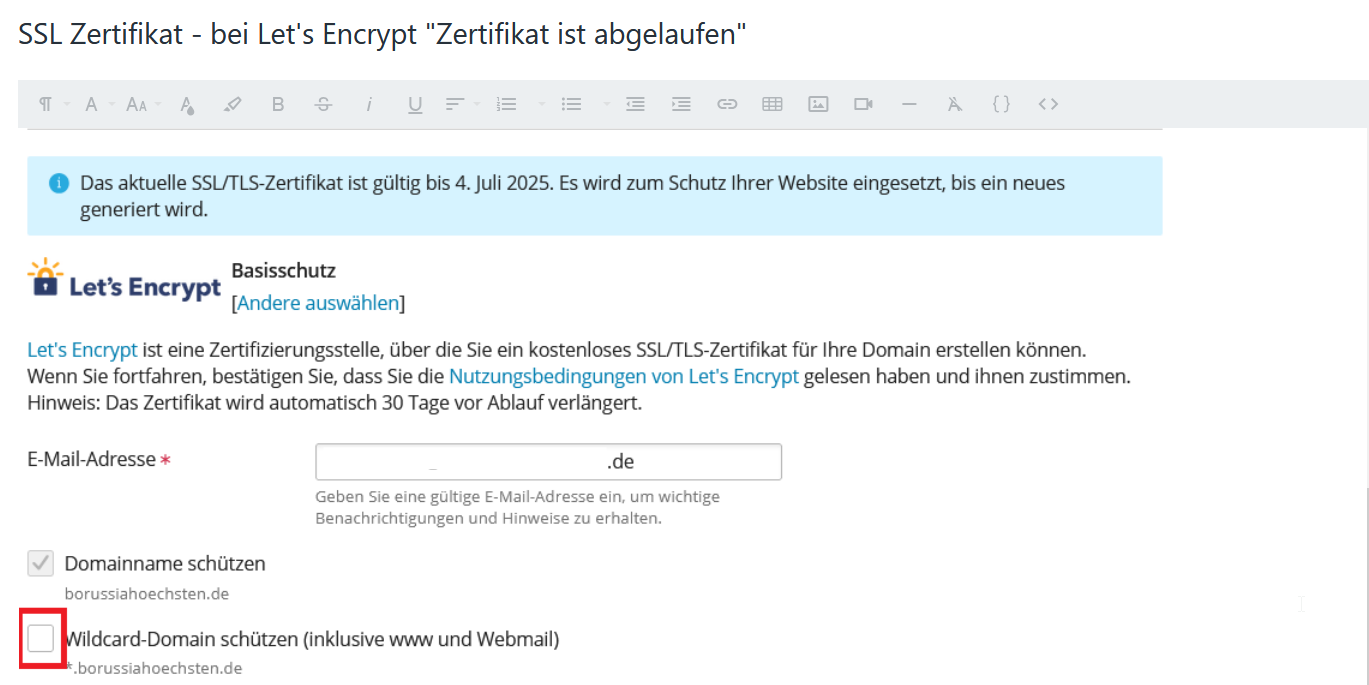Wenn das Wildcard SSL Zertifikat nicht zwingend benötigt wird, empfehlen wir, diese Option in Plesk zu entfernen. Anschließend sollte in Plesk die Information angezeigt werden "Wird automatisch verlängert".