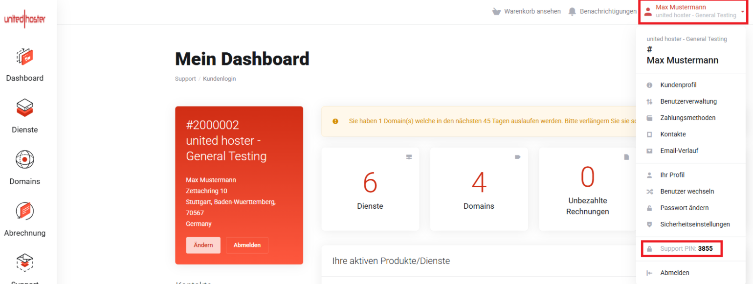 3. Im Menü sehen Sie nun Ihre Support PIN (siehe Screenshot)