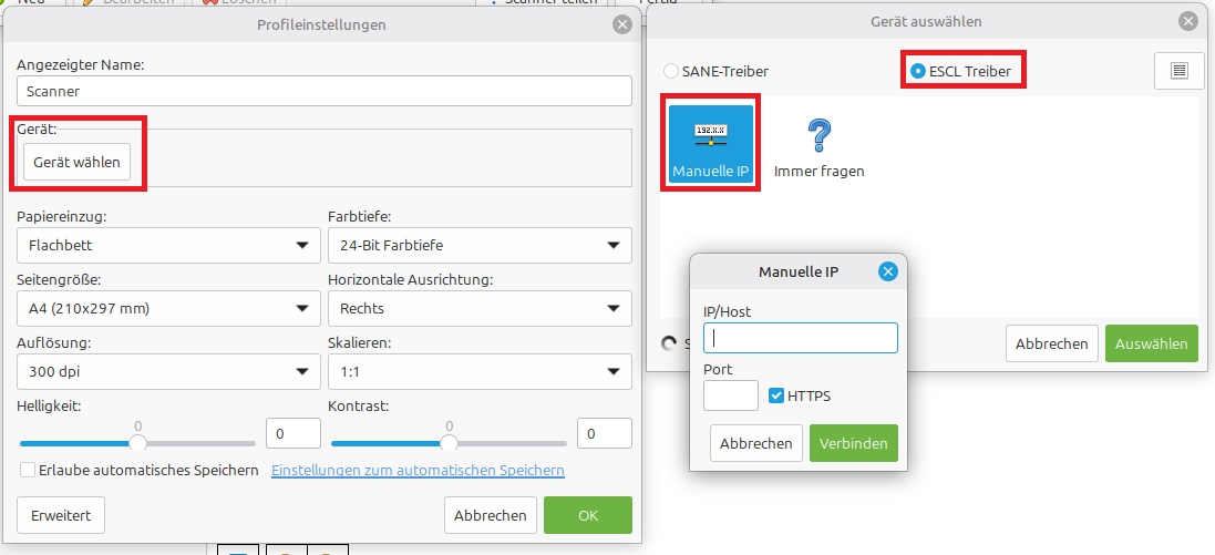 4. Klicken Sie nun auf Gerät wählen und wählen Sie den ESCL-Treiber aus. Die IP-Adresse Ihres Lokalen Computers kann nun mit einem Doppelklick auf Manuelle IP hinterlegt werden.