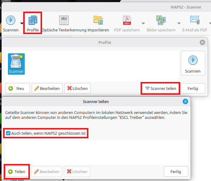 2. Klicken Sie auf Profile und wählen Sie den Punkt Scanner Teilen -> Teilen aus. Setzen Sie falls gewünscht ebenfalls den Haken bei "Auch teilen, wenn NAPS2 geschlossen ist".